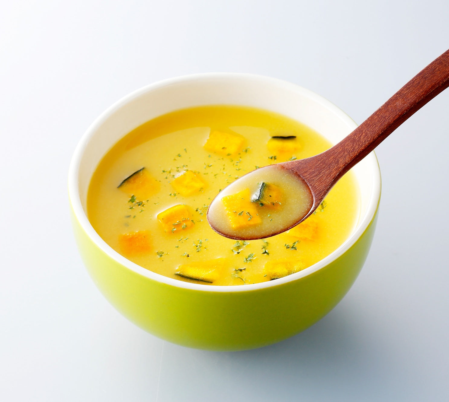 這是一款使用北海道產南瓜製成的湯品。不含乳製品和動物性萃取物。以豆乳為基底,保留了南瓜本身的甜味和營養,口感滑順。過敏原僅為「大豆」。
